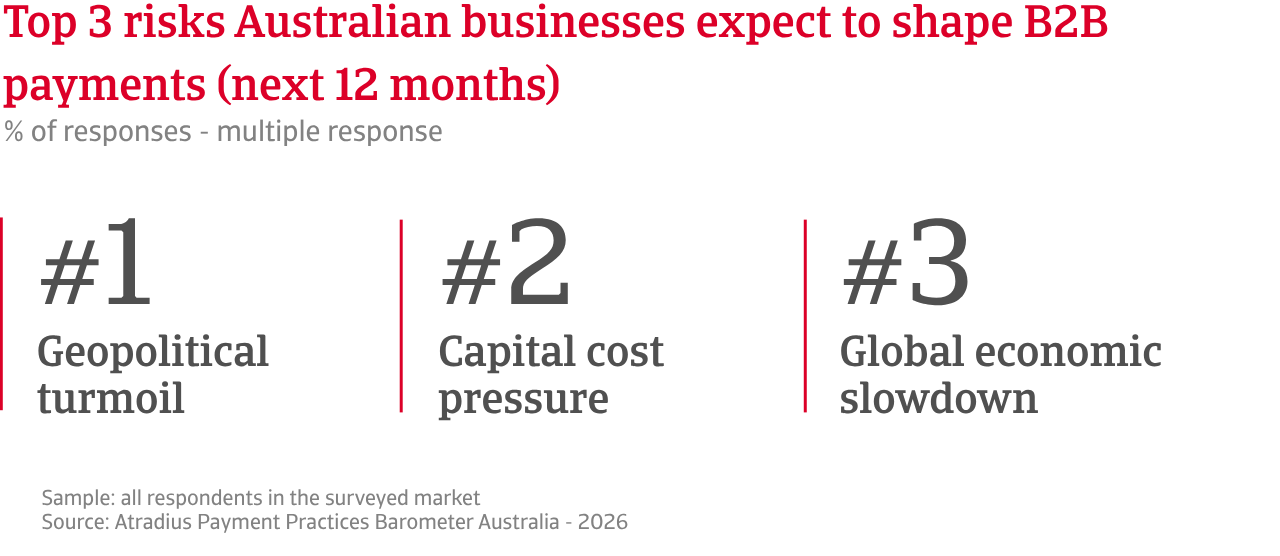 Companies surveyed in Australia report growing concern about volatile global markets as the current geopolitical turmoil is disrupting trade flows significantly. Uncertainty about how the situation will evolve is adding further pressure on supply chains. Operating costs are expected to remain high, while transport reliability is likely to deteriorate further in the months ahead. Businesses anticipate that disruption along key trade routes will continue to lengthen delivery times and strain supply chains. These developments are likely to feed directly into operating expenses and influence how businesses prioritise payments. Many companies anticipate a clear shift in B2B payment behaviour during the coming months as customers assess their own liquidity and adjust payment schedules accordingly.