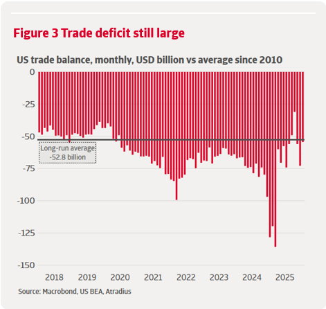 • Higher tariffs have reshaped trade patterns, not reduced the trade deficit. The US trade deficit remains wide as strong domestic demand, front loading effects and higher import prices have diluted the intended impact of protectionism